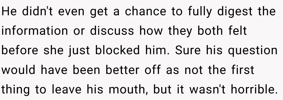 He didn't even get a chance to fully digest the information or discuss how they both felt before she just blocked him. Sure his question would have been better off as not the first thing to leave his mouth, but it wasn't horrible.