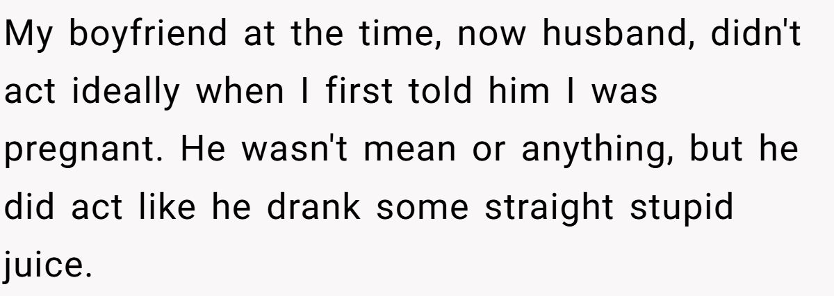 My boyfriend at the time, now husband, didn't act ideally when I first told him I was pregnant. He wasn't mean or anything, but he did act like he drank some straight stupid juice.