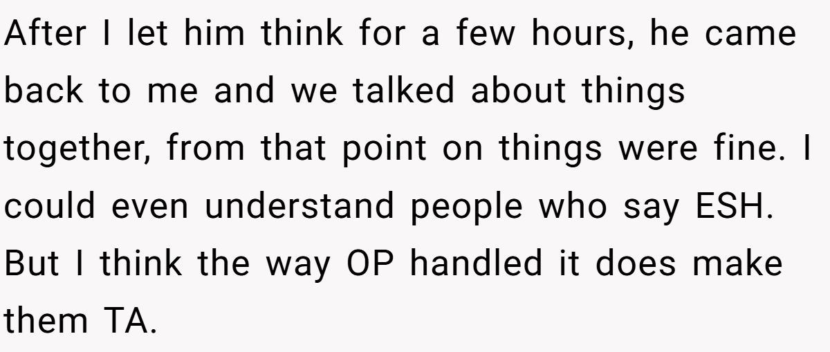 After I let him think for a few hours, he came back to me and we talked about things together, from that point on things were fine. I could even understand people who say ESH. But I think the way OP handled it does make them TA.