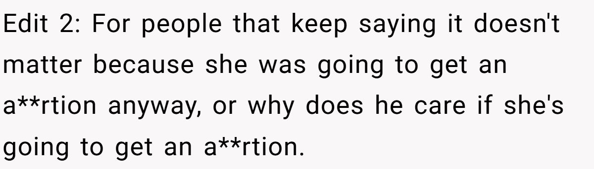Edit 2: For people that keep saying it doesn't matter because she was going to get an a**rtion anyway, or why does he care if she's going to get an a**rtion.