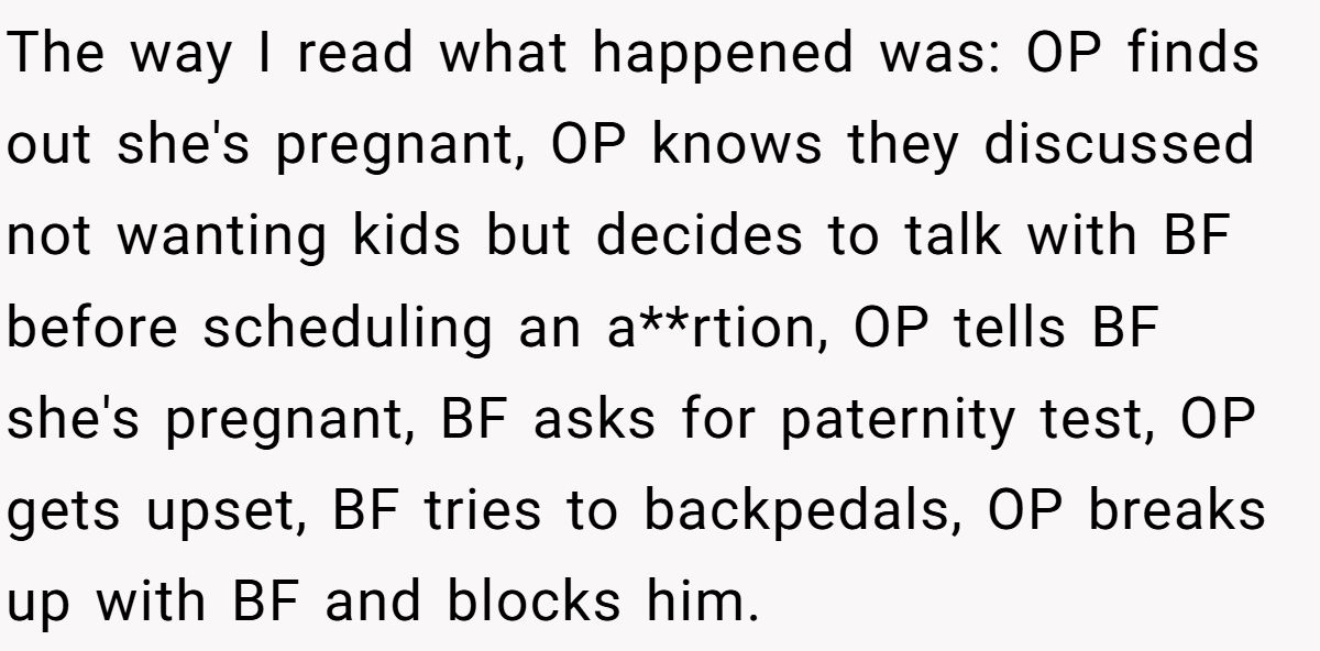The way I read what happened was: OP finds out she's pregnant, OP knows they discussed not wanting kids but decides to talk with BF before scheduling an a**rtion, OP tells BF she's pregnant, BF asks for paternity test, OP gets upset, BF tries to backpedals, OP breaks up with BF and blocks him.
