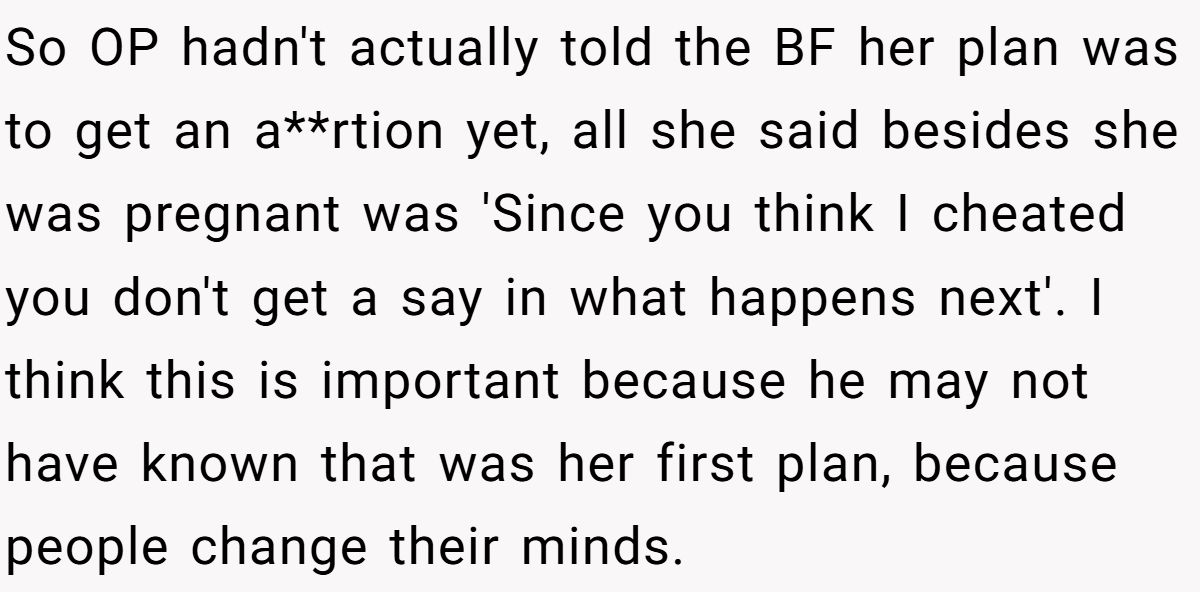 So OP hadn't actually told the BF her plan was to get an a**rtion yet, all she said besides she was pregnant was 'Since you think I cheated you don't get a say in what happens next'. I think this is important because he may not have known that was her first plan, because people change their minds.