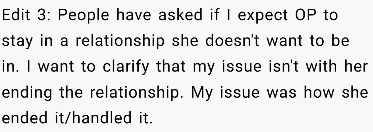 Edit 3: People have asked if I expect OP to stay in a relationship she doesn't want to be in. I want to clarify that my issue isn't with her ending the relationship. My issue was how she ended it/handled it.