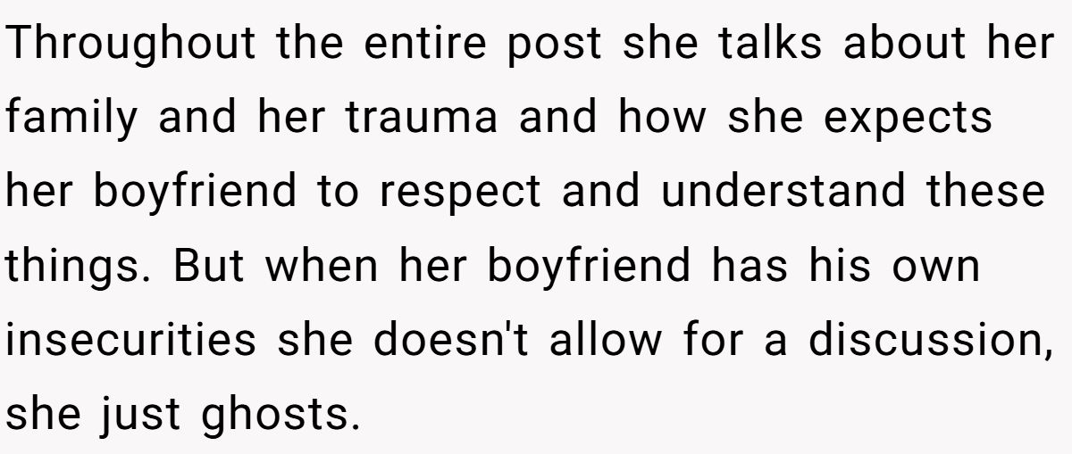 Throughout the entire post she talks about her family and her trauma and how she expects her boyfriend to respect and understand these things. But when her boyfriend has his own insecurities she doesn't allow for a discussion, she just ghosts.