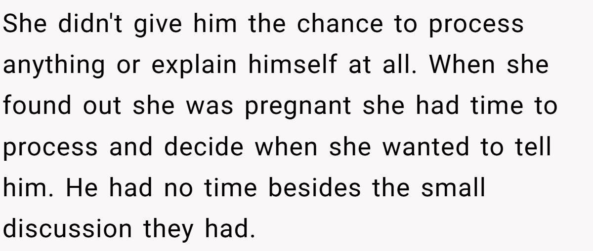 She didn't give him the chance to process anything or explain himself at all. When she found out she was pregnant she had time to process and decide when she wanted to tell him. He had no time besides the small discussion they had.