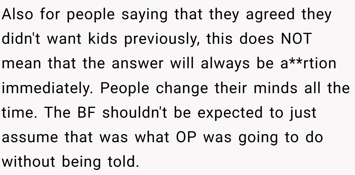 Also for people saying that they agreed they didn't want kids previously, this does NOT mean that the answer will always be a**rtion immediately. People change their minds all the time. The BF shouldn't be expected to just assume that was what OP was going to do without being told.