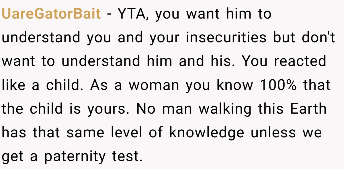 UareGatorBait − YTA, you want him to understand you and your insecurities but don't want to understand him and his. You reacted like a child. As a woman you know 100% that the child is yours. No man walking this Earth has that same level of knowledge unless we get a paternity test.