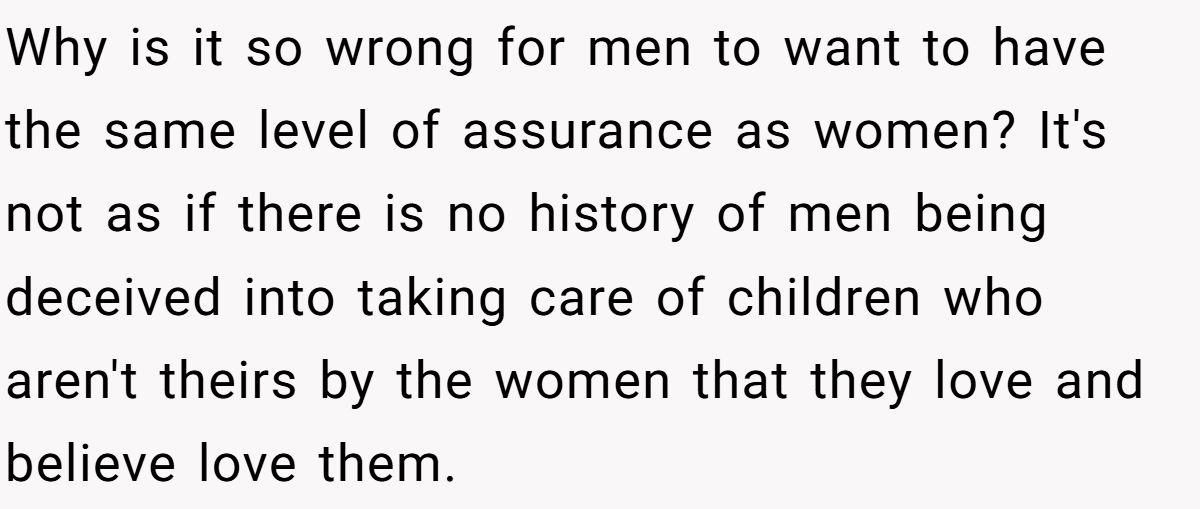 Why is it so wrong for men to want to have the same level of assurance as women? It's not as if there is no history of men being deceived into taking care of children who aren't theirs by the women that they love and believe love them.
