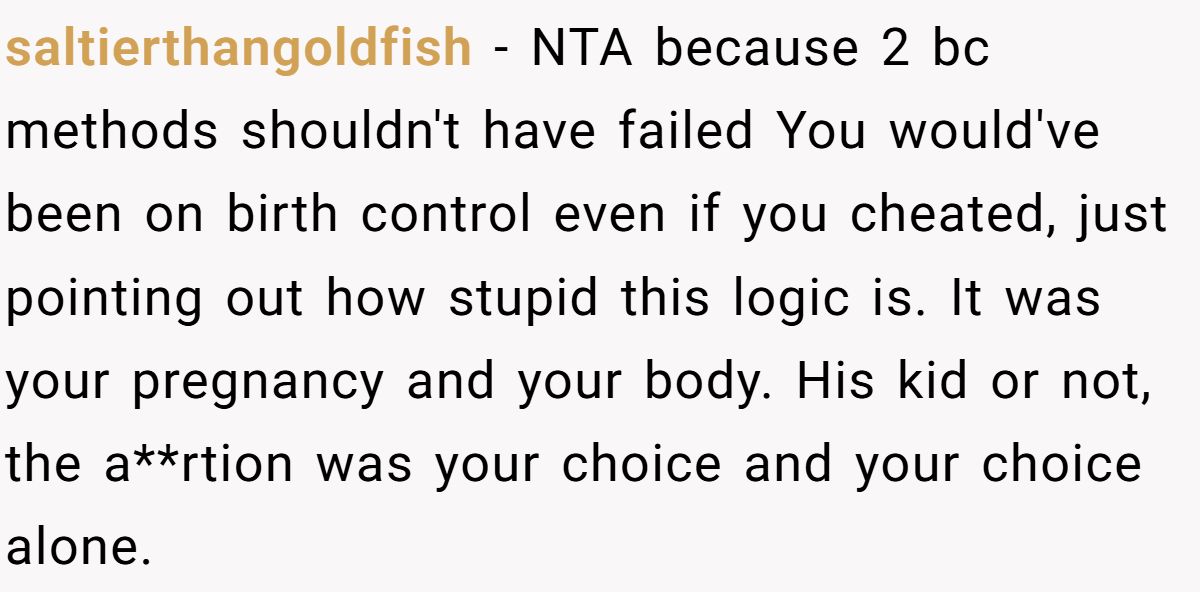 saltierthangoldfish − NTA because 2 bc methods shouldn't have failed You would've been on birth control even if you cheated, just pointing out how stupid this logic is. It was your pregnancy and your body. His kid or not, the a**rtion was your choice and your choice alone.