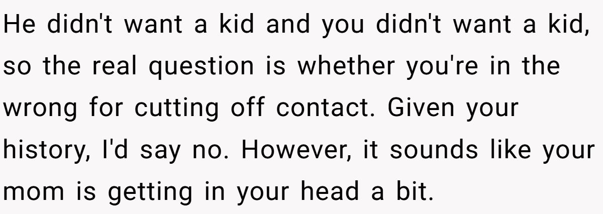 He didn't want a kid and you didn't want a kid, so the real question is whether you're in the wrong for cutting off contact. Given your history, I'd say no. However, it sounds like your mom is getting in your head a bit.