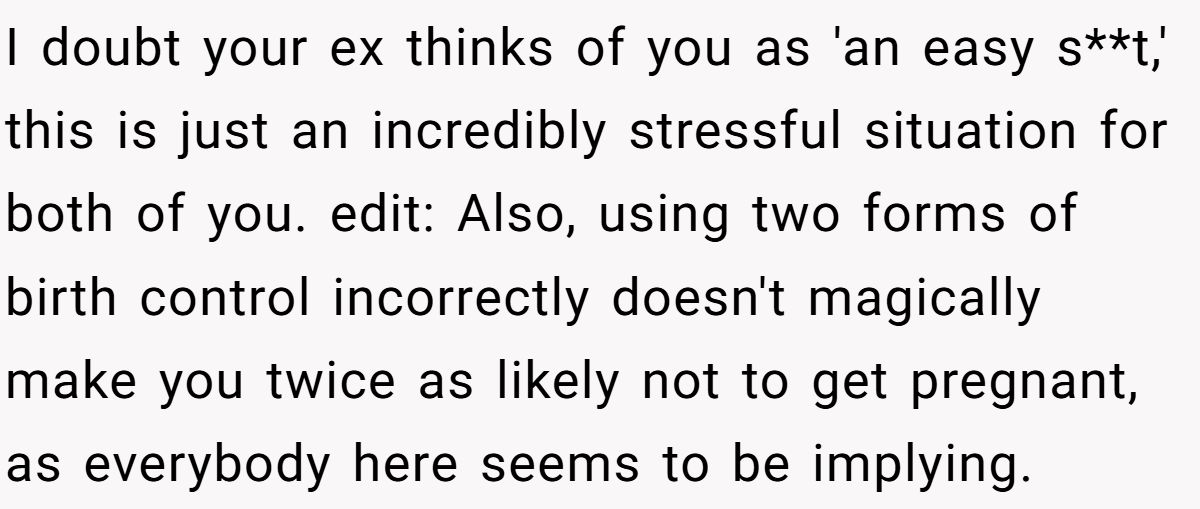 I doubt your ex thinks of you as 'an easy s**t,' this is just an incredibly stressful situation for both of you. edit: Also, using two forms of birth control incorrectly doesn't magically make you twice as likely not to get pregnant, as everybody here seems to be implying.