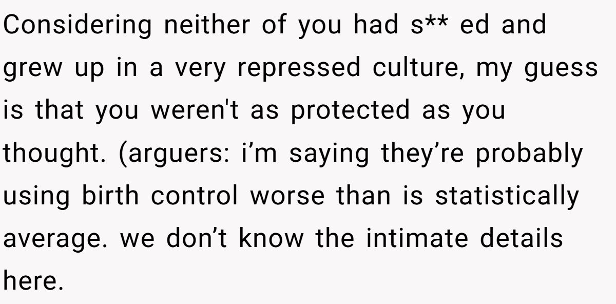 Considering neither of you had s** ed and grew up in a very repressed culture, my guess is that you weren't as protected as you thought. (arguers: i’m saying they’re probably using birth control worse than is statistically average. we don’t know the intimate details here.