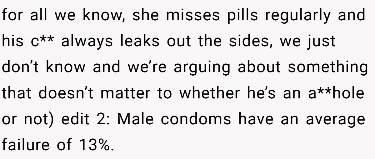 for all we know, she misses pills regularly and his c** always leaks out the sides, we just don’t know and we’re arguing about something that doesn’t matter to whether he’s an a**hole or not) edit 2: Male condoms have an average failure of 13%.