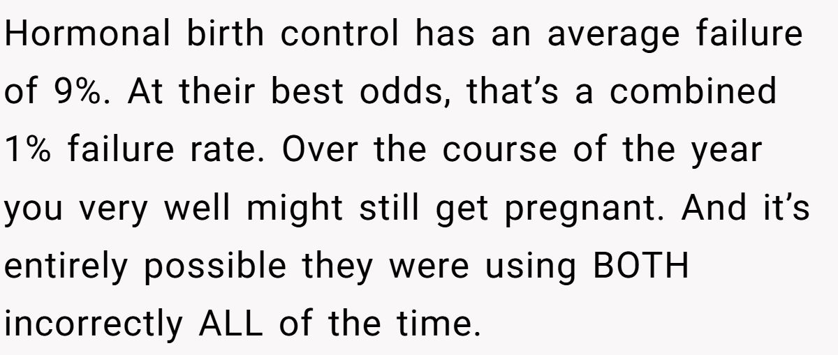 Hormonal birth control has an average failure of 9%. At their best odds, that’s a combined 1% failure rate. Over the course of the year you very well might still get pregnant. And it’s entirely possible they were using BOTH incorrectly ALL of the time.