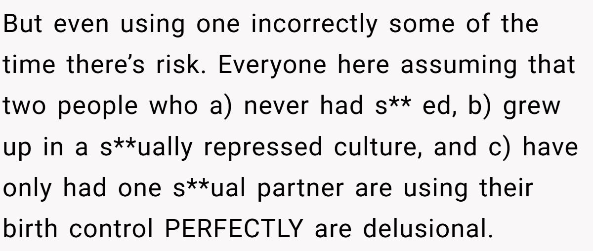 But even using one incorrectly some of the time there’s risk. Everyone here assuming that two people who a) never had s** ed, b) grew up in a s**ually repressed culture, and c) have only had one s**ual partner are using their birth control PERFECTLY are delusional.
