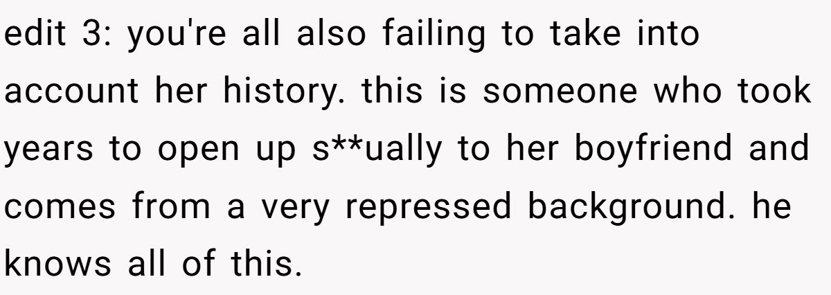 edit 3: you're all also failing to take into account her history. this is someone who took years to open up s**ually to her boyfriend and comes from a very repressed background. he knows all of this.