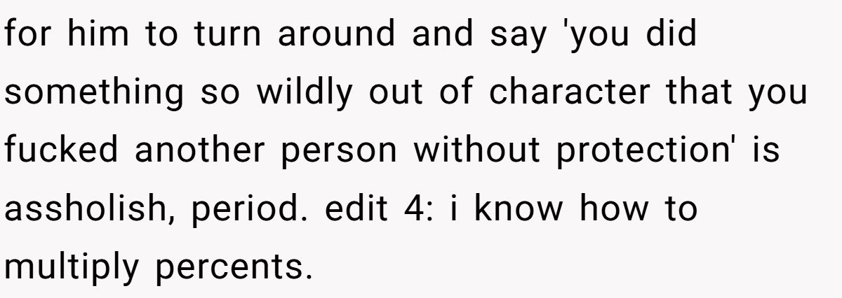 for him to turn around and say 'you did something so wildly out of character that you fucked another person without protection' is assholish, period. edit 4: i know how to multiply percents.