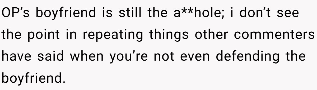 OP’s boyfriend is still the a**hole; i don’t see the point in repeating things other commenters have said when you’re not even defending the boyfriend.