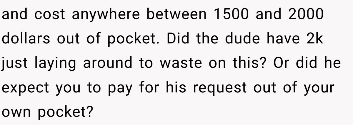 and cost anywhere between 1500 and 2000 dollars out of pocket. Did the dude have 2k just laying around to waste on this? Or did he expect you to pay for his request out of your own pocket?