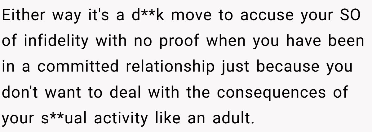 Either way it's a d**k move to accuse your SO of infidelity with no proof when you have been in a committed relationship just because you don't want to deal with the consequences of your s**ual activity like an adult.