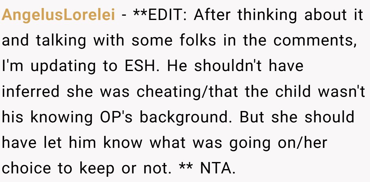 AngelusLorelei − **EDIT: After thinking about it and talking with some folks in the comments, I'm updating to ESH. He shouldn't have inferred she was cheating/that the child wasn't his knowing OP's background. But she should have let him know what was going on/her choice to keep or not. ** NTA.