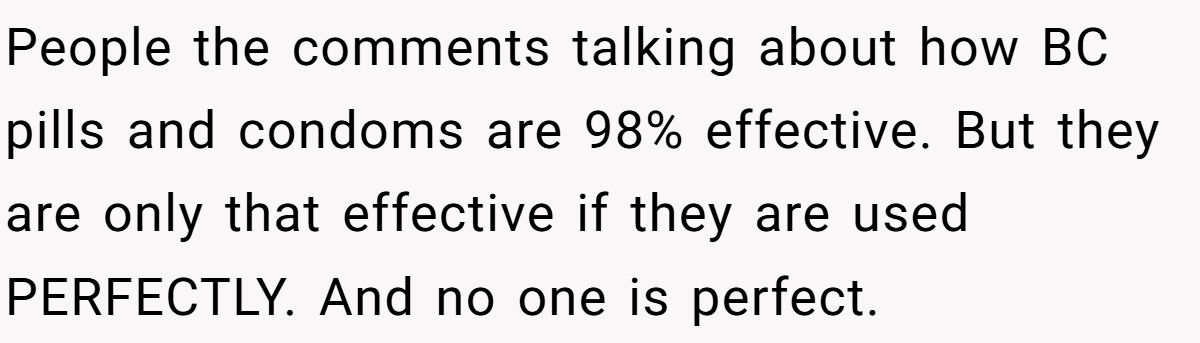 People the comments talking about how BC pills and condoms are 98% effective. But they are only that effective if they are used PERFECTLY. And no one is perfect.