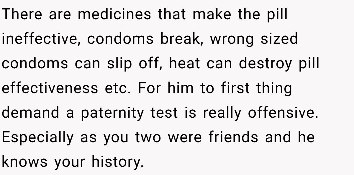 There are medicines that make the pill ineffective, condoms break, wrong sized condoms can slip off, heat can destroy pill effectiveness etc. For him to first thing demand a paternity test is really offensive. Especially as you two were friends and he knows your history.