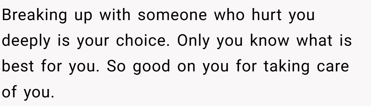 Breaking up with someone who hurt you deeply is your choice. Only you know what is best for you. So good on you for taking care of you.