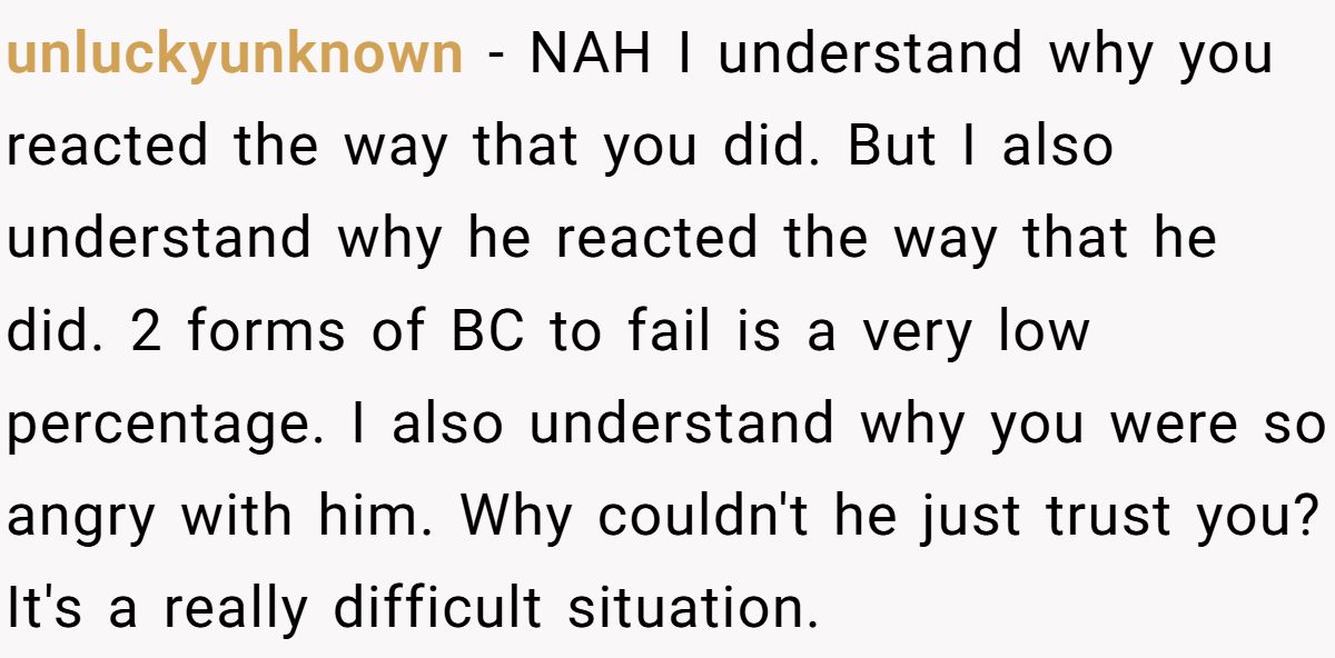 unluckyunknown − NAH I understand why you reacted the way that you did. But I also understand why he reacted the way that he did. 2 forms of BC to fail is a very low percentage. I also understand why you were so angry with him. Why couldn't he just trust you? It's a really difficult situation.