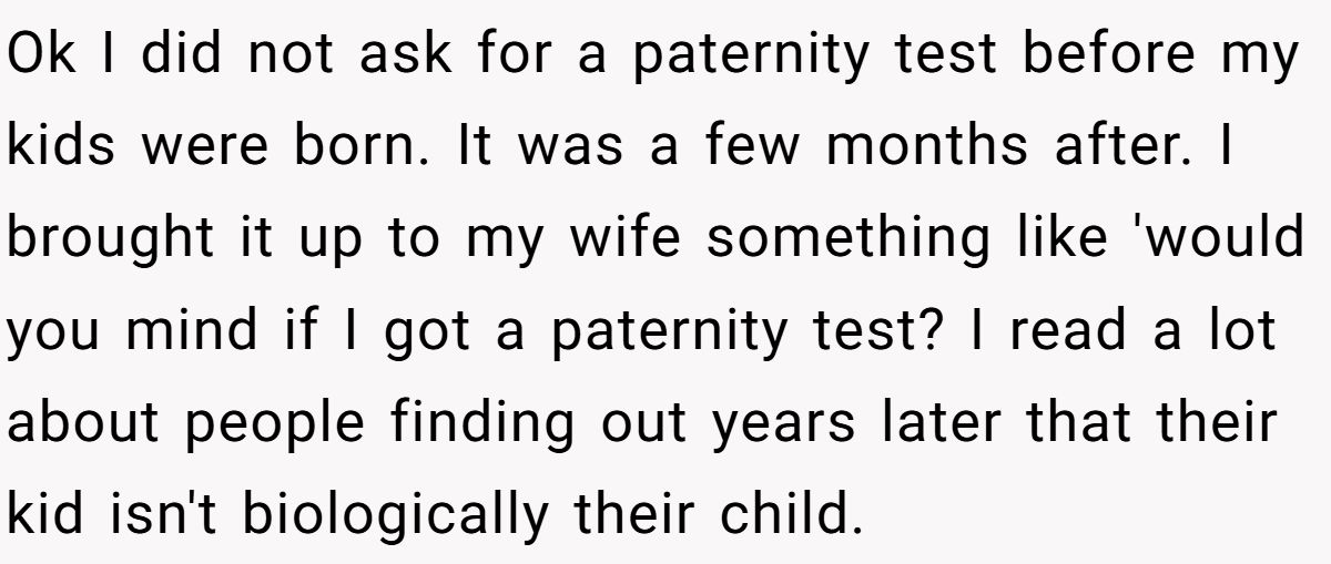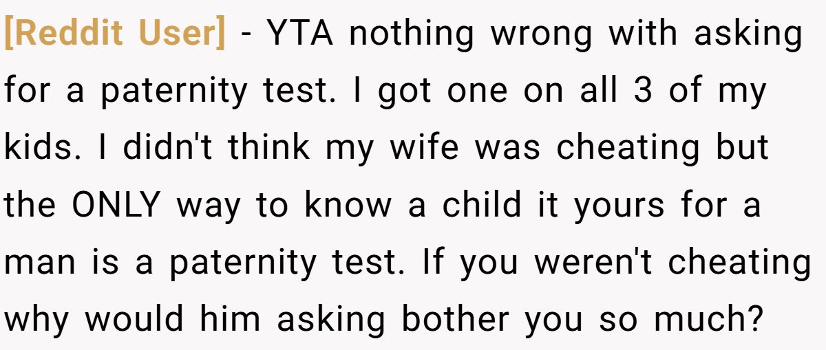 [Reddit User] − YTA nothing wrong with asking for a paternity test. I got one on all 3 of my kids. I didn't think my wife was cheating but the ONLY way to know a child it yours for a man is a paternity test. If you weren't cheating why would him asking bother you so much?