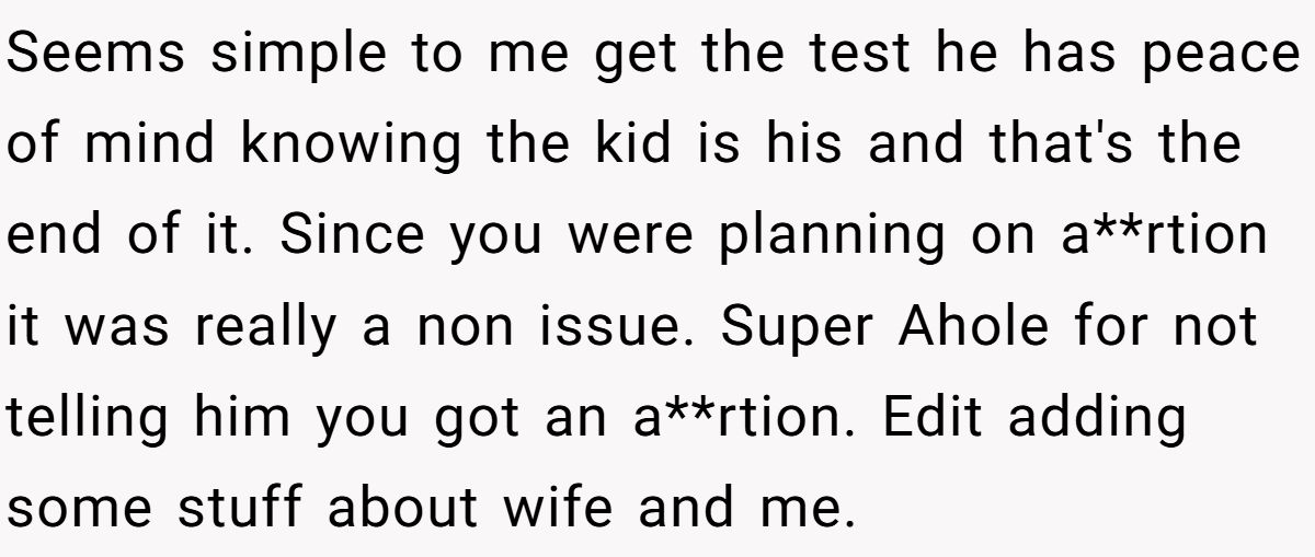 Seems simple to me get the test he has peace of mind knowing the kid is his and that's the end of it. Since you were planning on a**rtion it was really a non issue. Super Ahole for not telling him you got an a**rtion. Edit adding some stuff about wife and me.