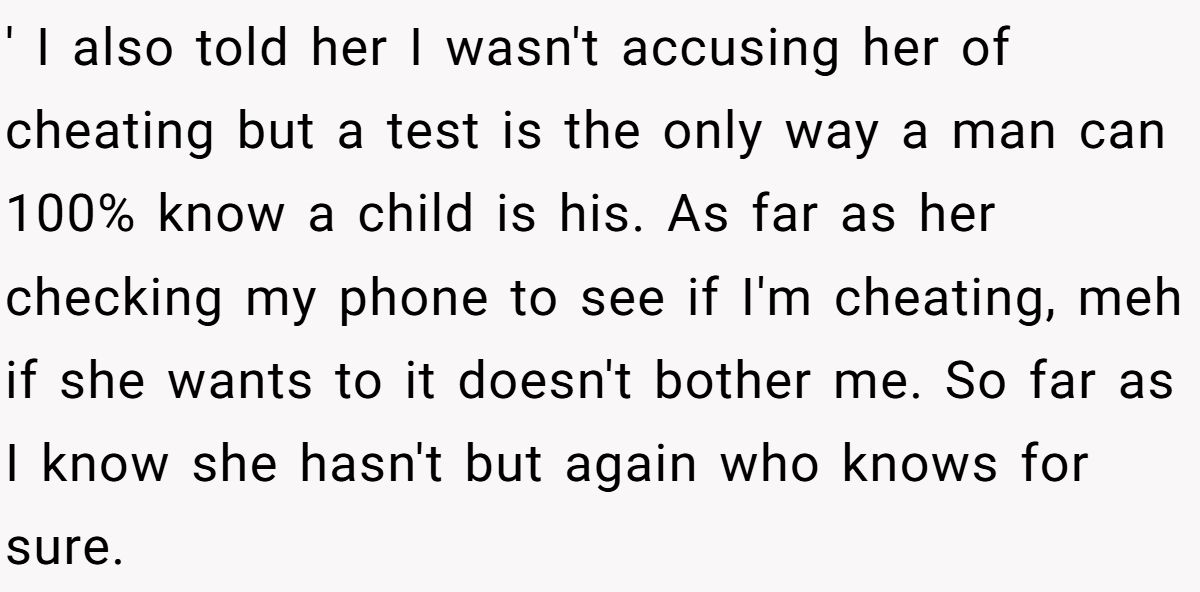 ' I also told her I wasn't accusing her of cheating but a test is the only way a man can 100% know a child is his. As far as her checking my phone to see if I'm cheating, meh if she wants to it doesn't bother me. So far as I know she hasn't but again who knows for sure.