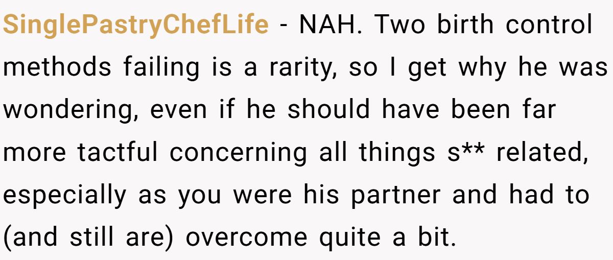 SinglePastryChefLife − NAH. Two birth control methods failing is a rarity, so I get why he was wondering, even if he should have been far more tactful concerning all things s** related, especially as you were his partner and had to (and still are) overcome quite a bit.
