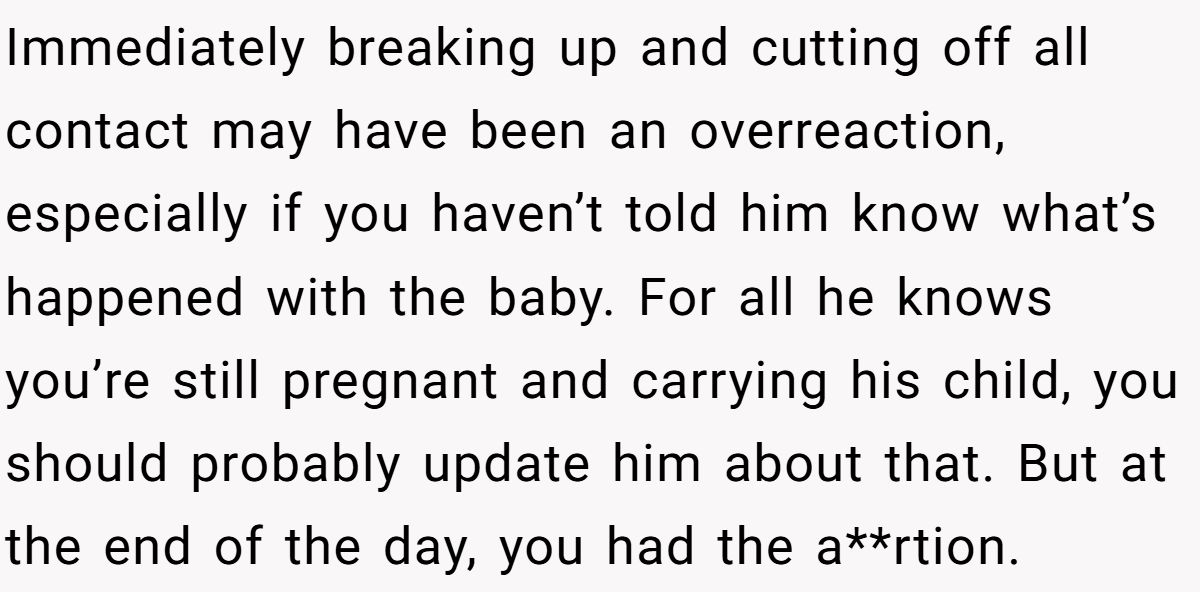 Immediately breaking up and cutting off all contact may have been an overreaction, especially if you haven’t told him know what’s happened with the baby. For all he knows you’re still pregnant and carrying his child, you should probably update him about that. But at the end of the day, you had the a**rtion.