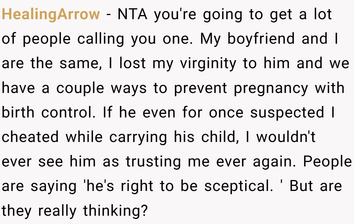HealingArrow − NTA you're going to get a lot of people calling you one. My boyfriend and I are the same, I lost my virginity to him and we have a couple ways to prevent pregnancy with birth control. If he even for once suspected I cheated while carrying his child, I wouldn't ever see him as trusting me ever again. People are saying 'he's right to be sceptical. ' But are they really thinking?
