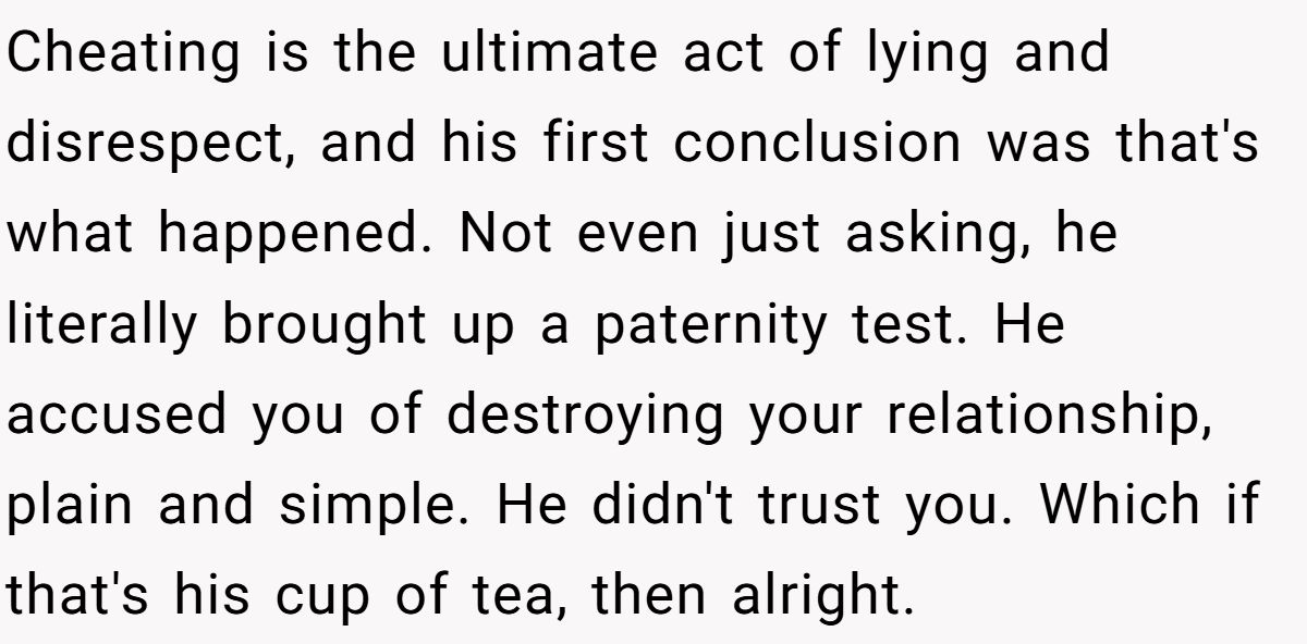 Cheating is the ultimate act of lying and disrespect, and his first conclusion was that's what happened. Not even just asking, he literally brought up a paternity test. He accused you of destroying your relationship, plain and simple. He didn't trust you. Which if that's his cup of tea, then alright.