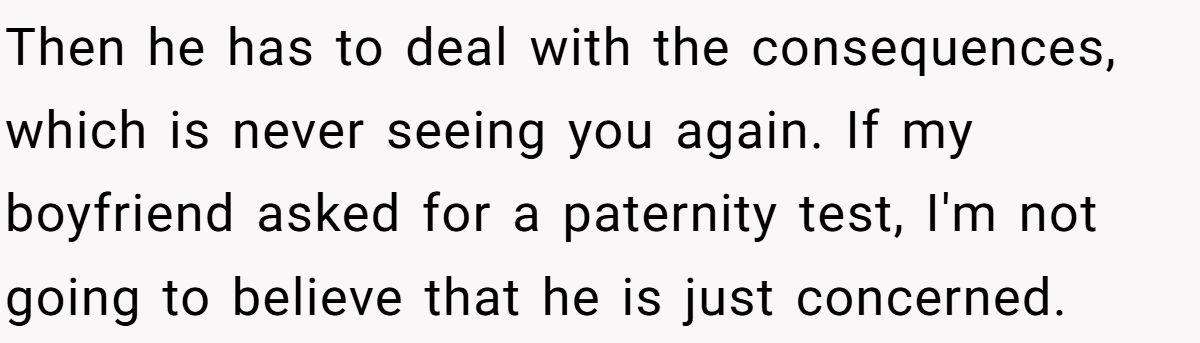 Then he has to deal with the consequences, which is never seeing you again. If my boyfriend asked for a paternity test, I'm not going to believe that he is just concerned.