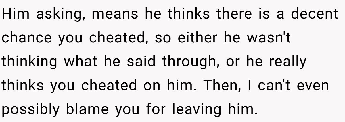 Him asking, means he thinks there is a decent chance you cheated, so either he wasn't thinking what he said through, or he really thinks you cheated on him. Then, I can't even possibly blame you for leaving him.