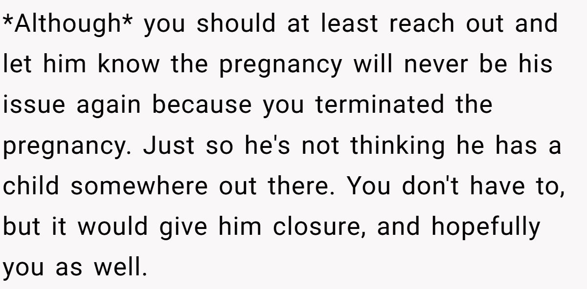 *Although* you should at least reach out and let him know the pregnancy will never be his issue again because you terminated the pregnancy. Just so he's not thinking he has a child somewhere out there. You don't have to, but it would give him closure, and hopefully you as well.