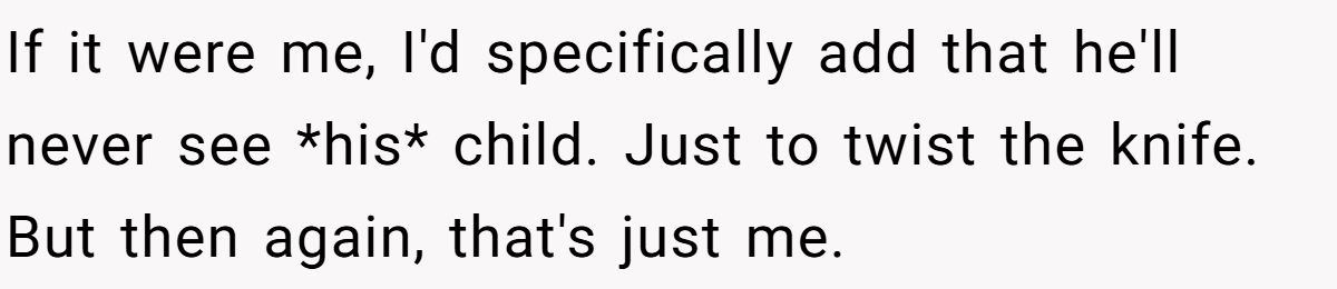 If it were me, I'd specifically add that he'll never see *his* child. Just to twist the knife. But then again, that's just me.