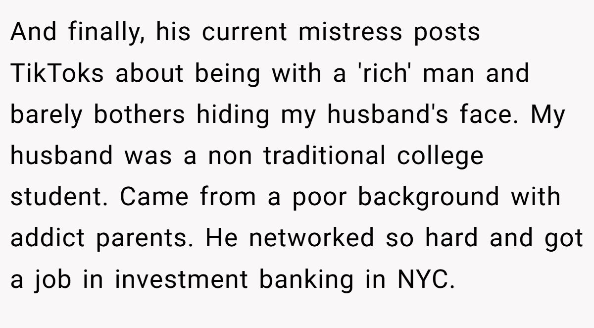 For 13 years, she played the part. She smiled through the whispers, looked away from the late nights, and convinced herself that stability mattered more than betrayal. Her husband, a high-earning banker, didn’t just cheat. He broadcasted it. Strip clubs. Mistresses. One woman even flaunted her “sponsored” apartment on TikTok, a place he paid for while his wife folded laundry and helped their kids with homework.