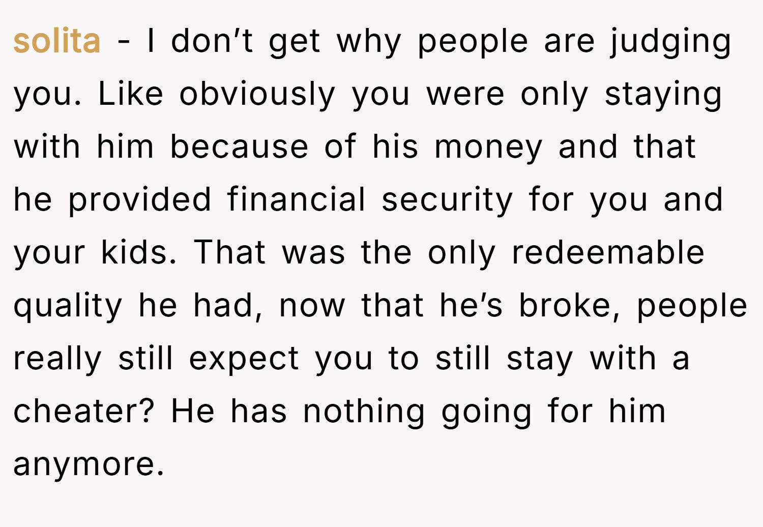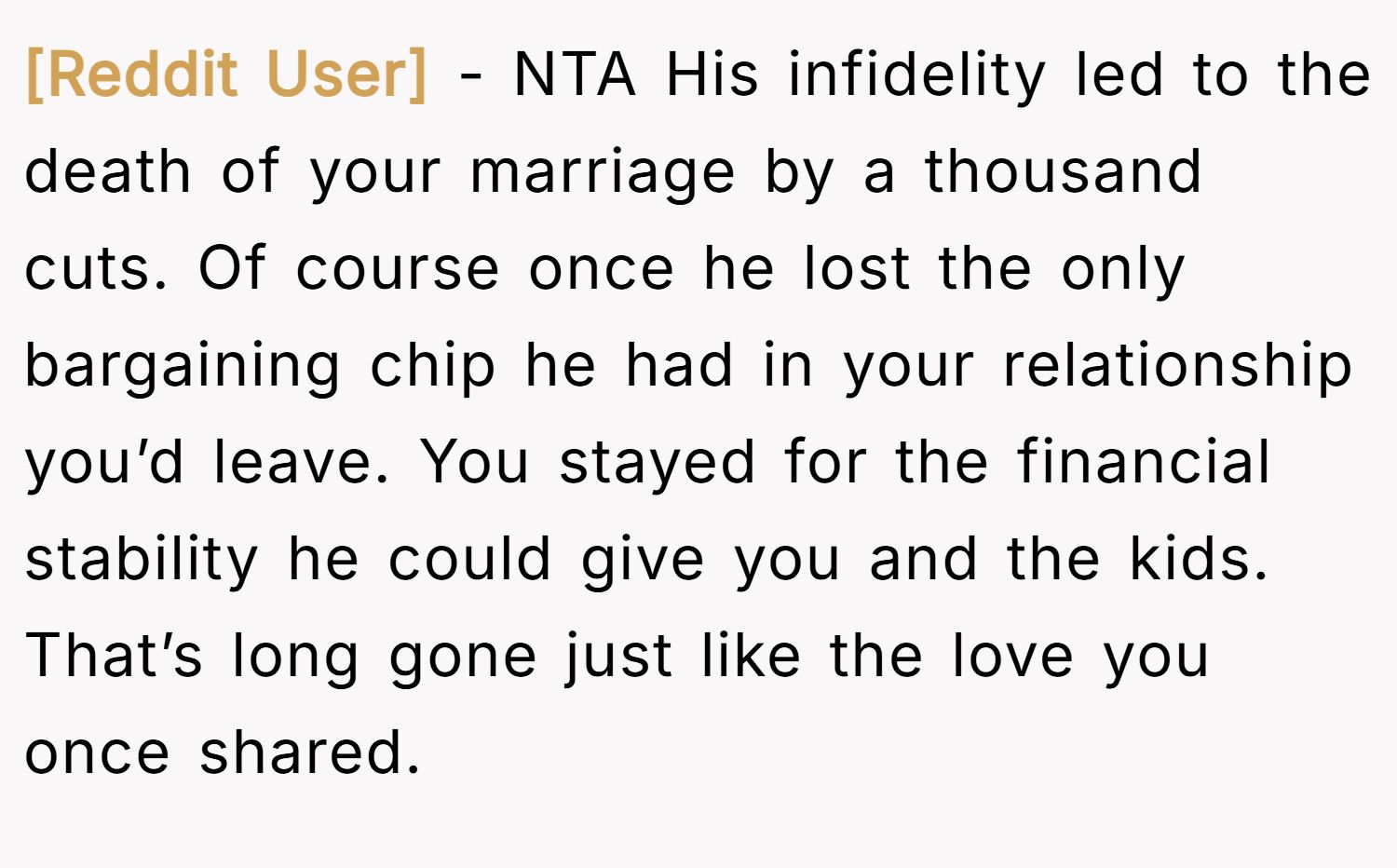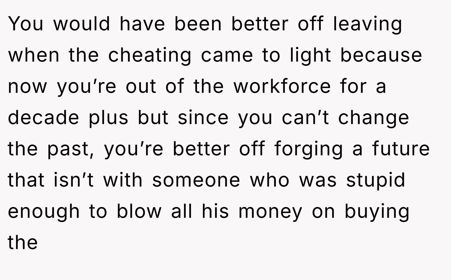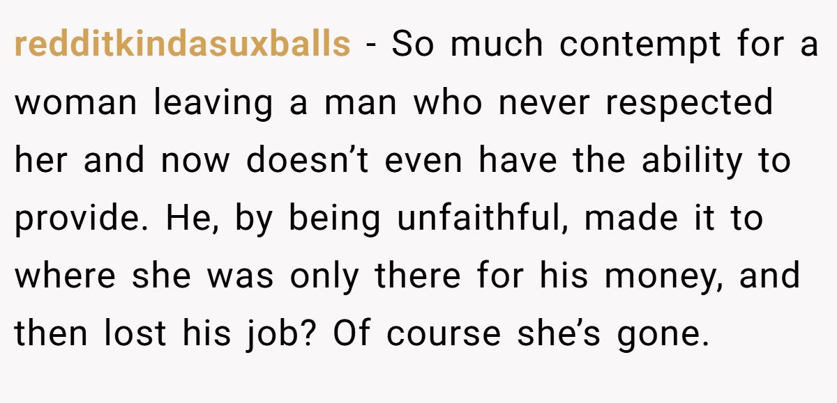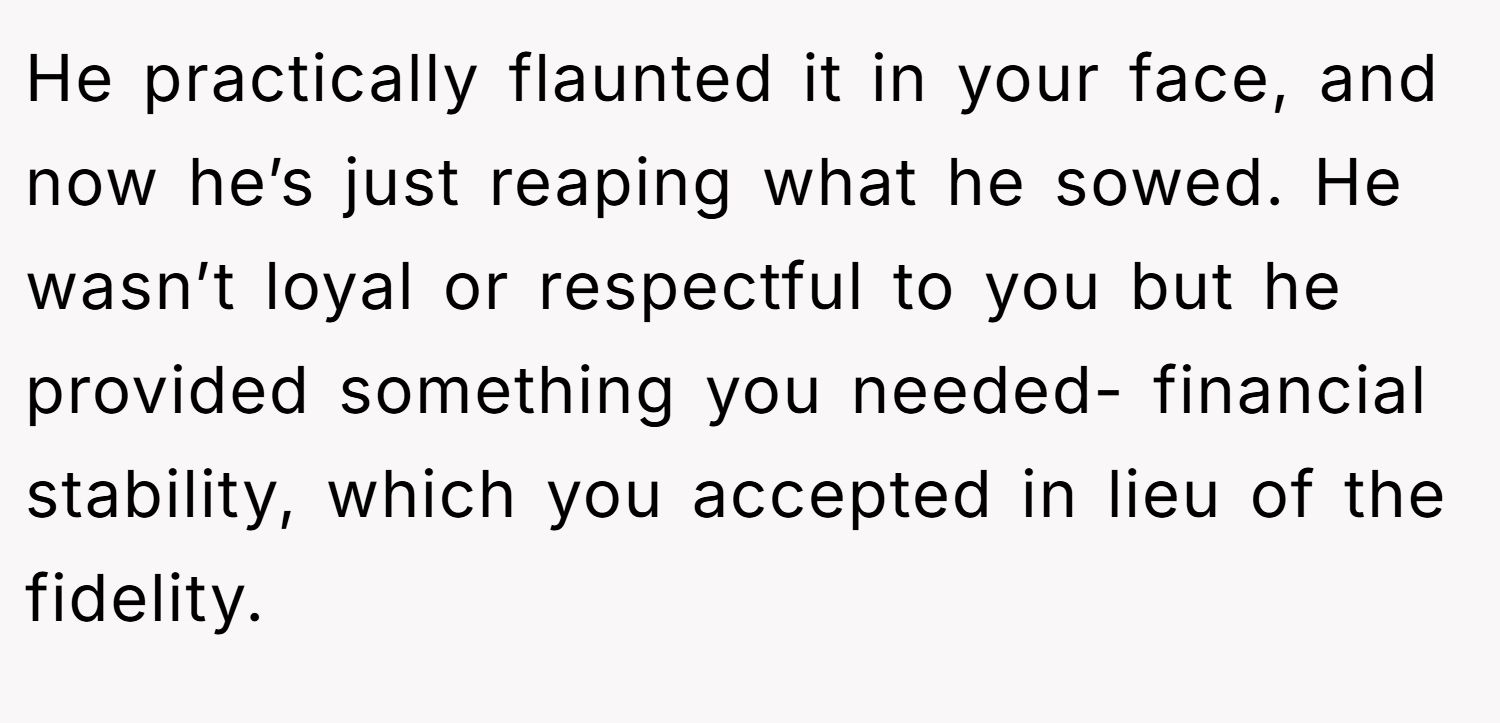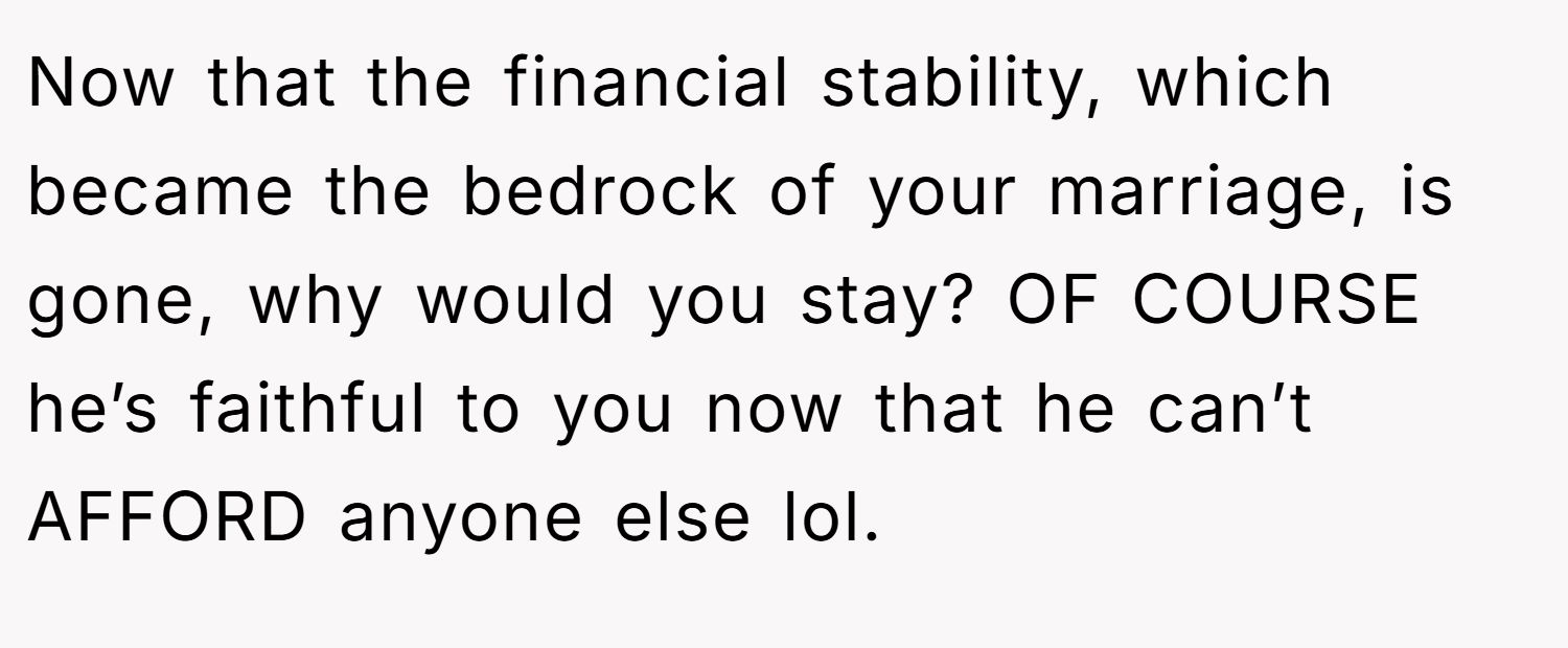 One commenter said it best — his cheating didn’t ruin the marriage all at once, it wore it down piece by piece. And when the money disappeared, so did the last reason to stay.