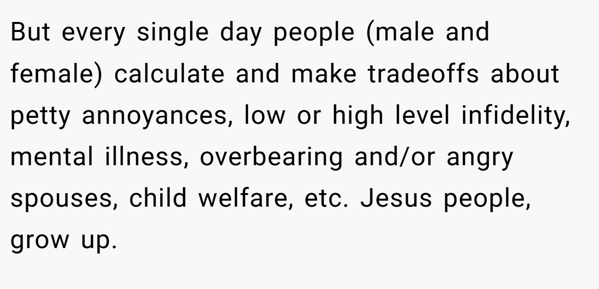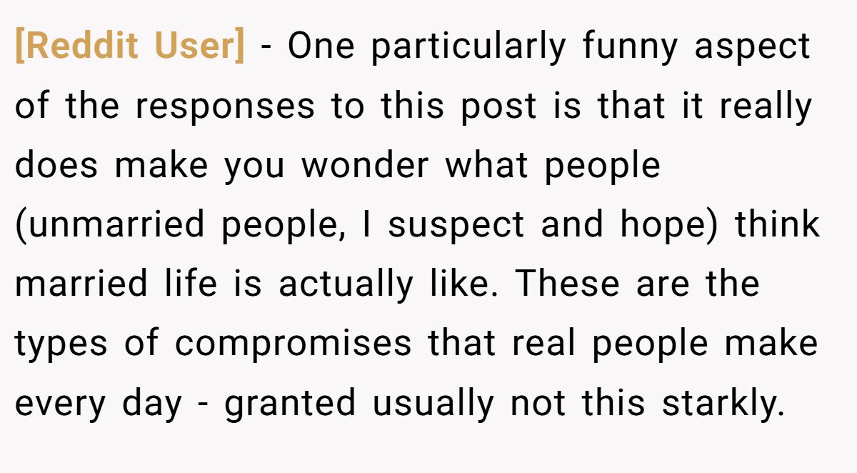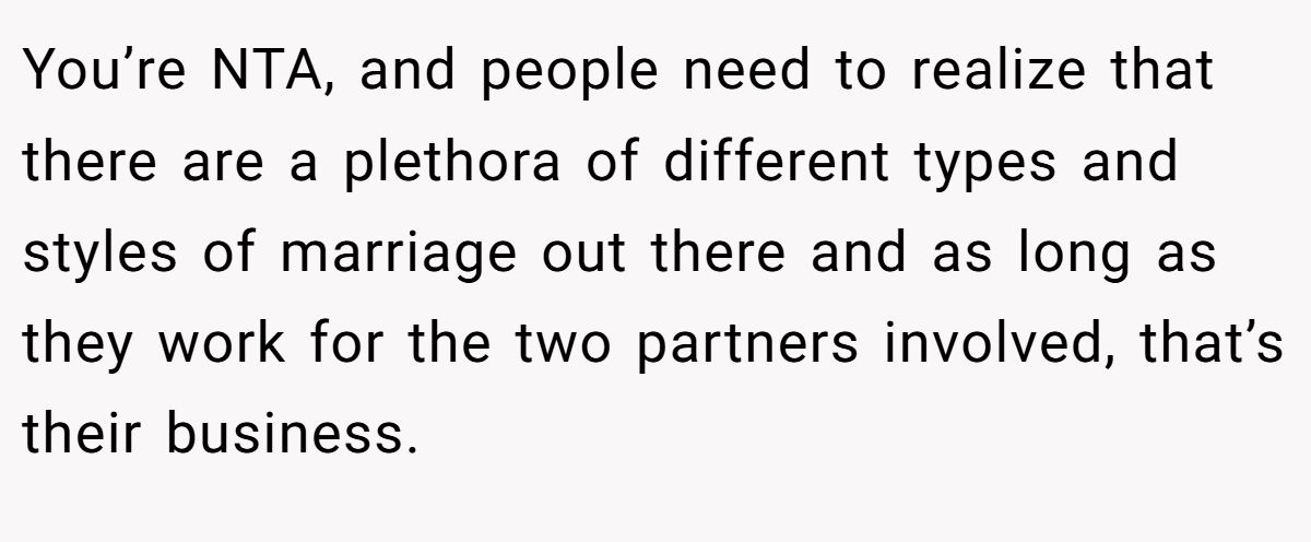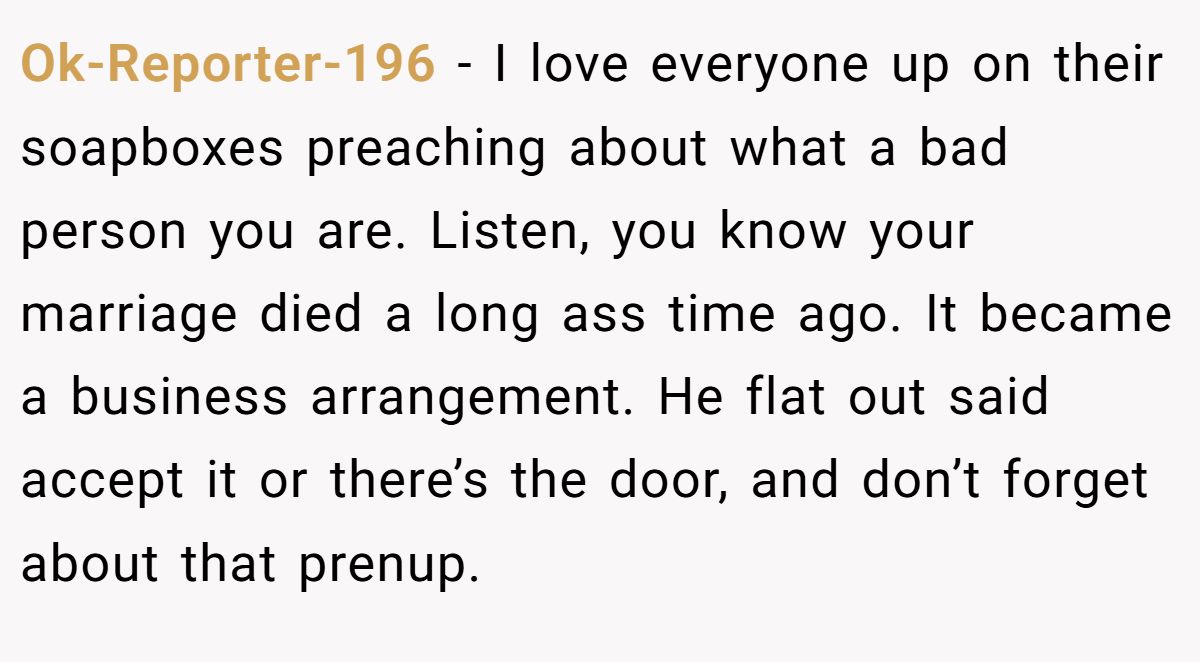 One commenter took a step back and pointed out the bigger truth — real marriages are messy, full of tradeoffs and quiet sacrifices. It might not always look pretty, but these are the kinds of choices people make every day. And honestly? They’re right. It’s easy to judge from the outside, but living it is a whole different story.