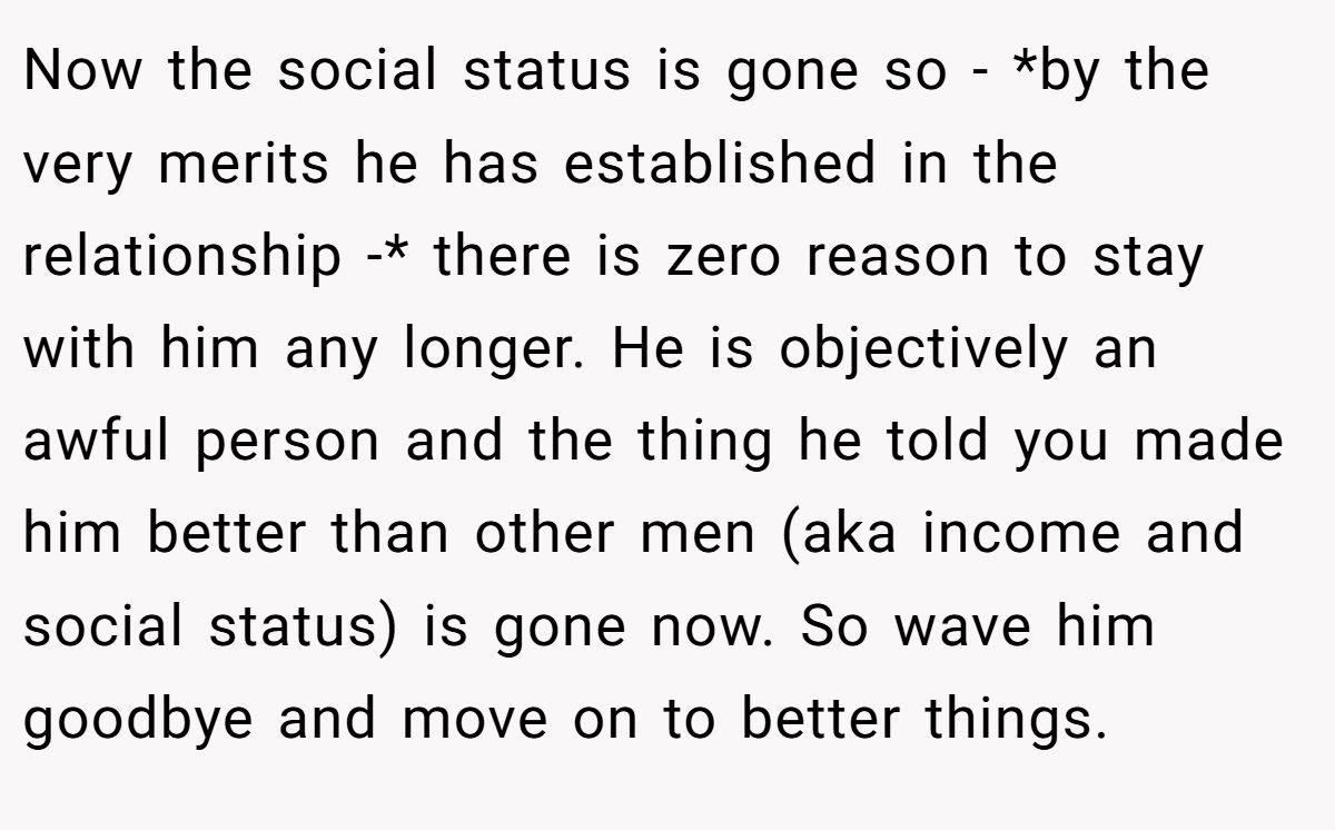 User soIita made a sharp point — if the only thing he brought to the table was money, and now even that’s gone, why would anyone expect her to stay?