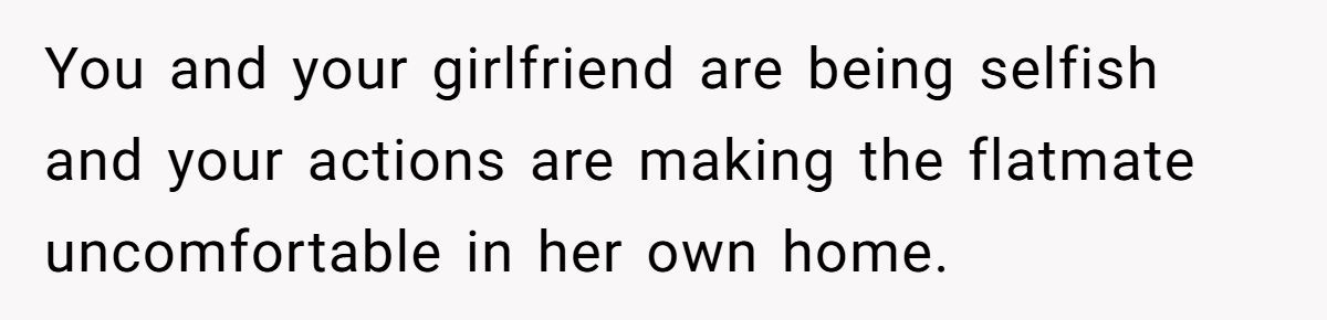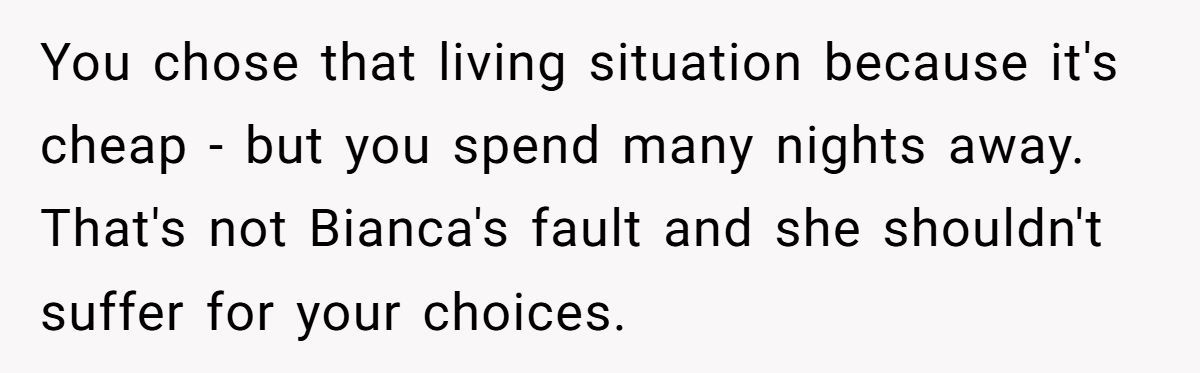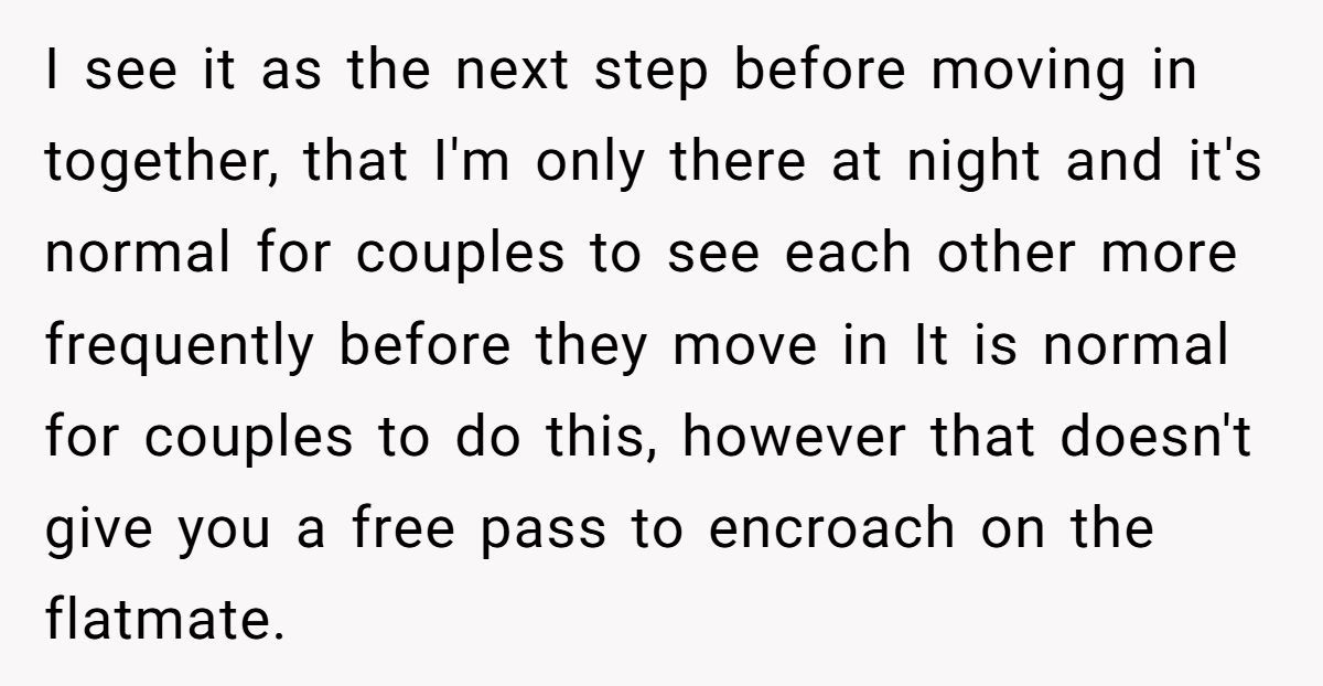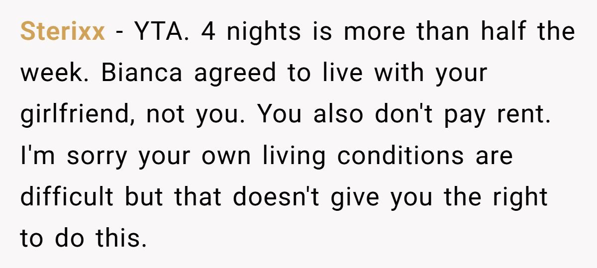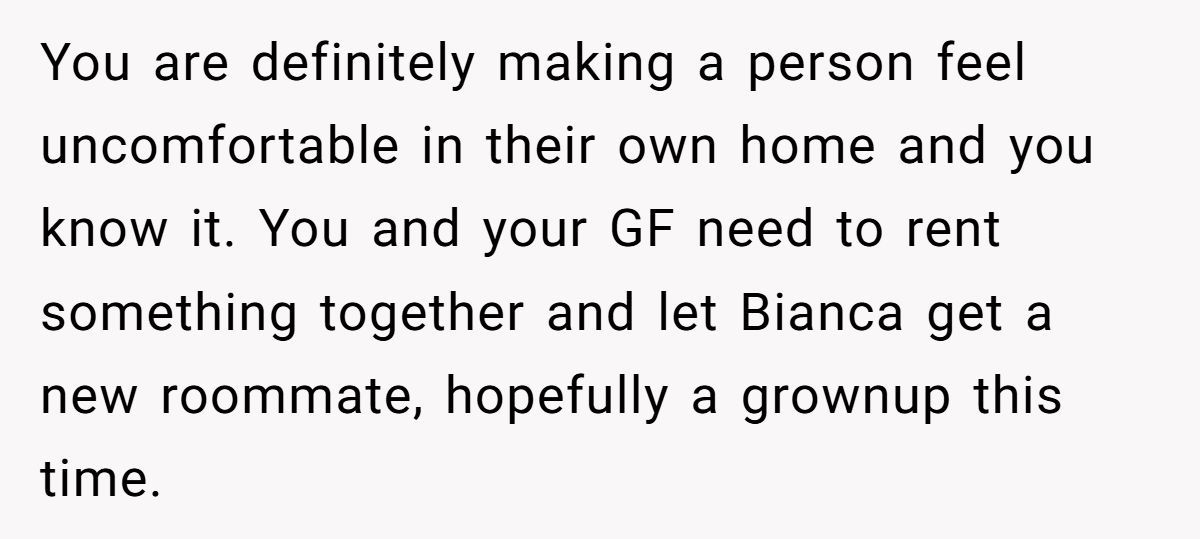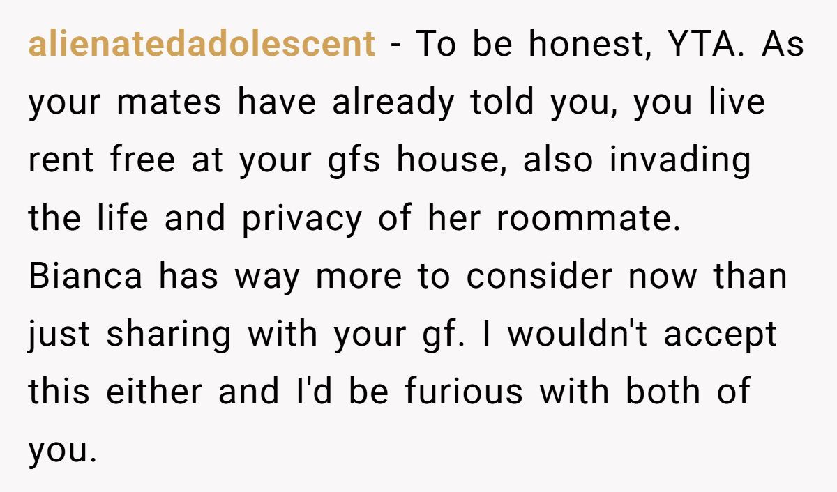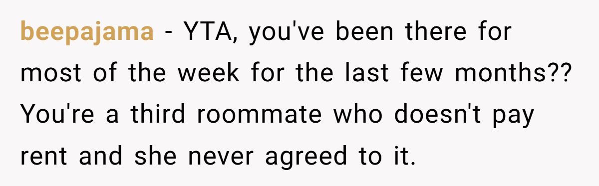 Most commenters agreed: the boyfriend wasn’t just visiting anymore, he had become an unofficial third roommate who didn’t pay rent, and Bianca never signed up for that.