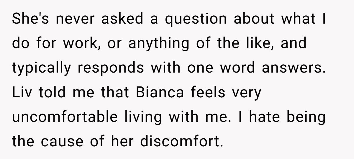 Liv may have felt comfortable hosting her boyfriend, but hosting someone half the week changes a household dynamic. Bianca’s discomfort, though never verbalized directly, was valid.