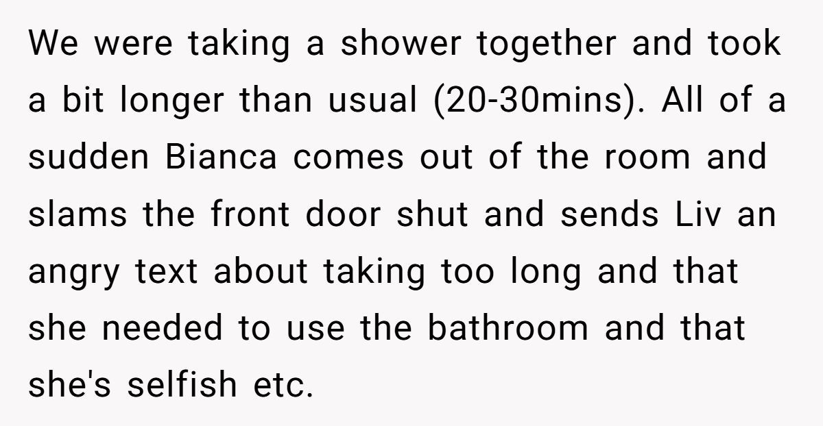 But to Liv’s roommate Bianca, his near-constant presence wasn’t cozy—it was invasive. And after one particularly long shower, the tension boiled over into slammed doors and a flurry of angry texts.