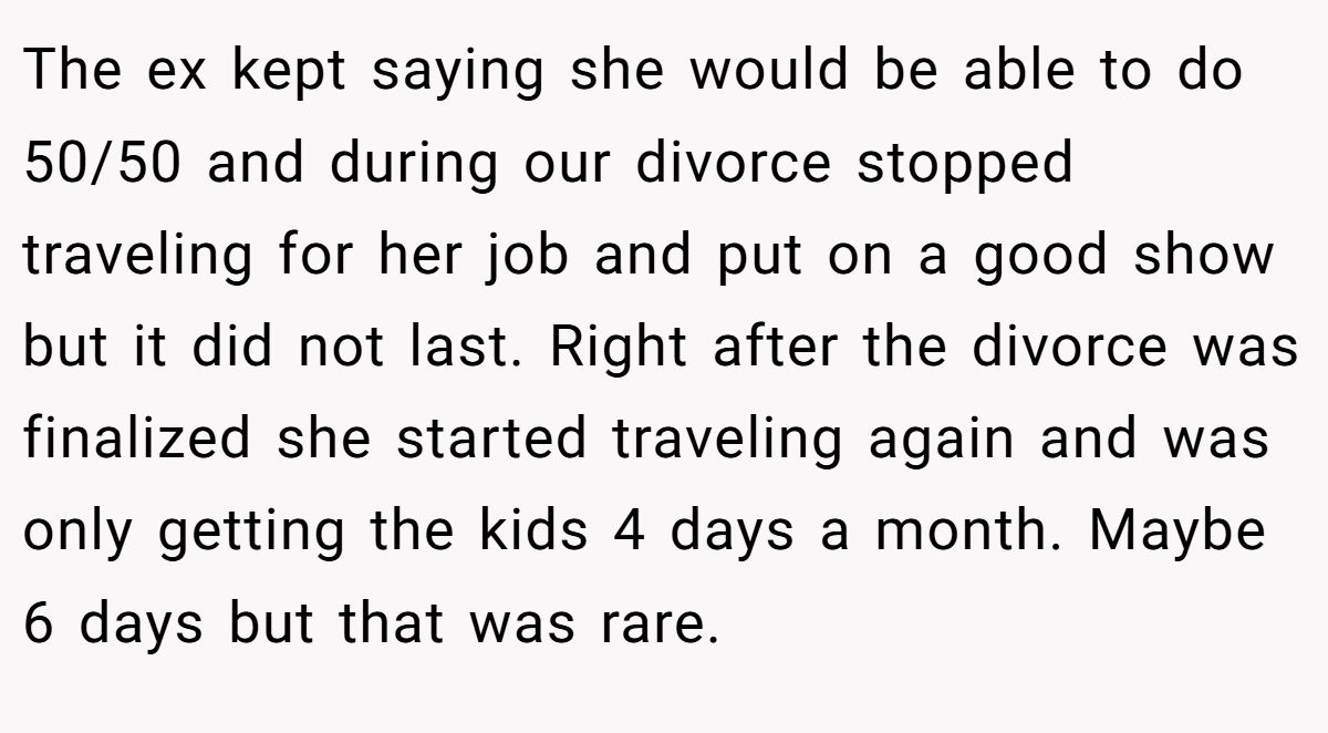 This dad didn’t sign up to play referee. But once the custody agreement was signed, it didn’t take long for him to realize he was flying solo far more than he should have been. The original plan, 50/50 parenting time, sounded fair. Until his ex-wife, a frequent flyer for work, started missing visit after visit. Four days a month was typical. Six if she really tried. But the promised 14? It never happened.