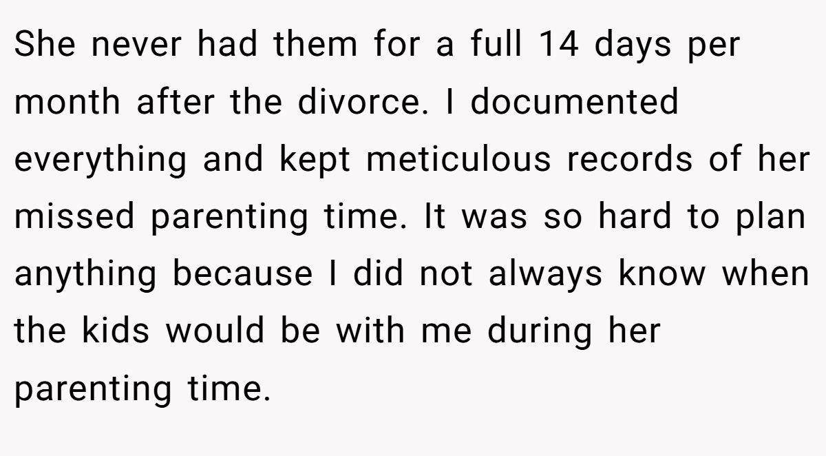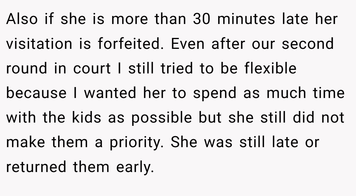 He kept receipts. All of them. Every missed pickup, every early return, every last-minute change. One year in, he had enough proof to go back to court. This time, the judge granted him primary physical custody and introduced a clause that made it crystal clear: show up more than 30 minutes late, and visitation gets forfeited.