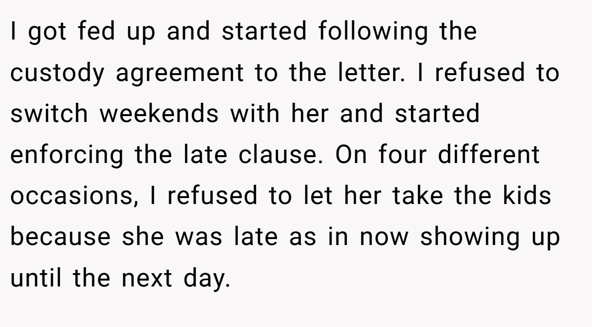 Still, the same pattern continued. She was late. She canceled. She popped in when it was convenient. So he stopped being flexible. He followed the agreement word for word.